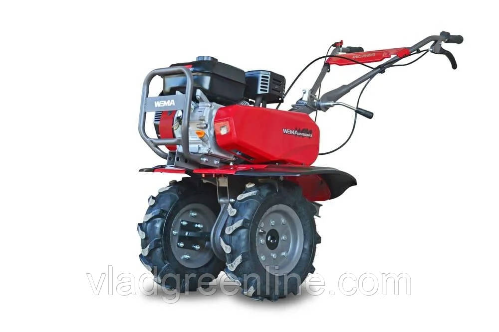 WEIMA WM900М-3 DELUXE New design 7,0 л.с., з чугунним редуктором має 3+1 швидкості, колеса 4,00-8 (40 см). З усіх представлених в Україні аналогічних мотоблоків, Вейма WM900-3 - найбільш збалансований. Завдяки заниженому кріпленню двигуна є можливість з меншими зусиллями працювати, зокрема, на вузеньких міжряддях.